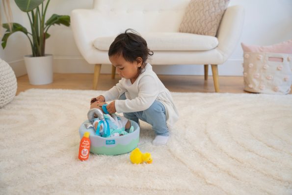 Stella needs a bath! A soft tub with faux running water made of ribbon. Comes with a bathrobe, soft ducky, and soft shampoo bottle. The perfect Stella accessory for your child’s soft doll collection.